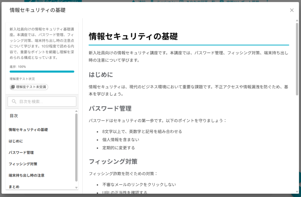 3. 最後まで読むと、「理解度テストを受ける」ボタンがありますので、理解度テストを受けてください。