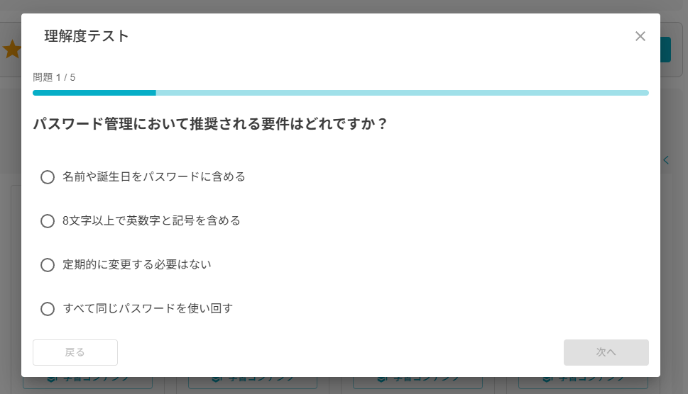 理解度テストは何度でも受けることができ、コース一覧には最後の理解度テストの正解数が表示されます。